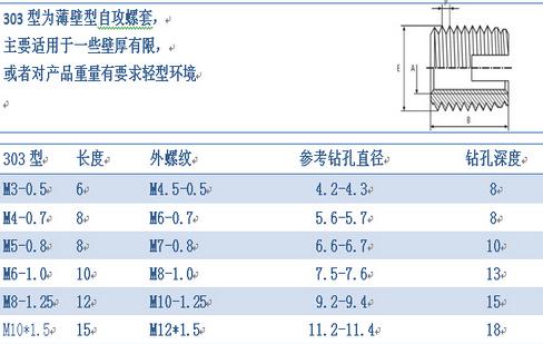 薄壁型丽江自攻螺套外观上看主要有两种区分,一种是一端开槽型的,另一种是一端三圆孔型的,其中开圆孔型的又分为307型和308型两种,307型和308型外观主要区别就是同一直径下,长度和外径大小有所区分。以上各种型式螺套均具有自行攻牙功能。